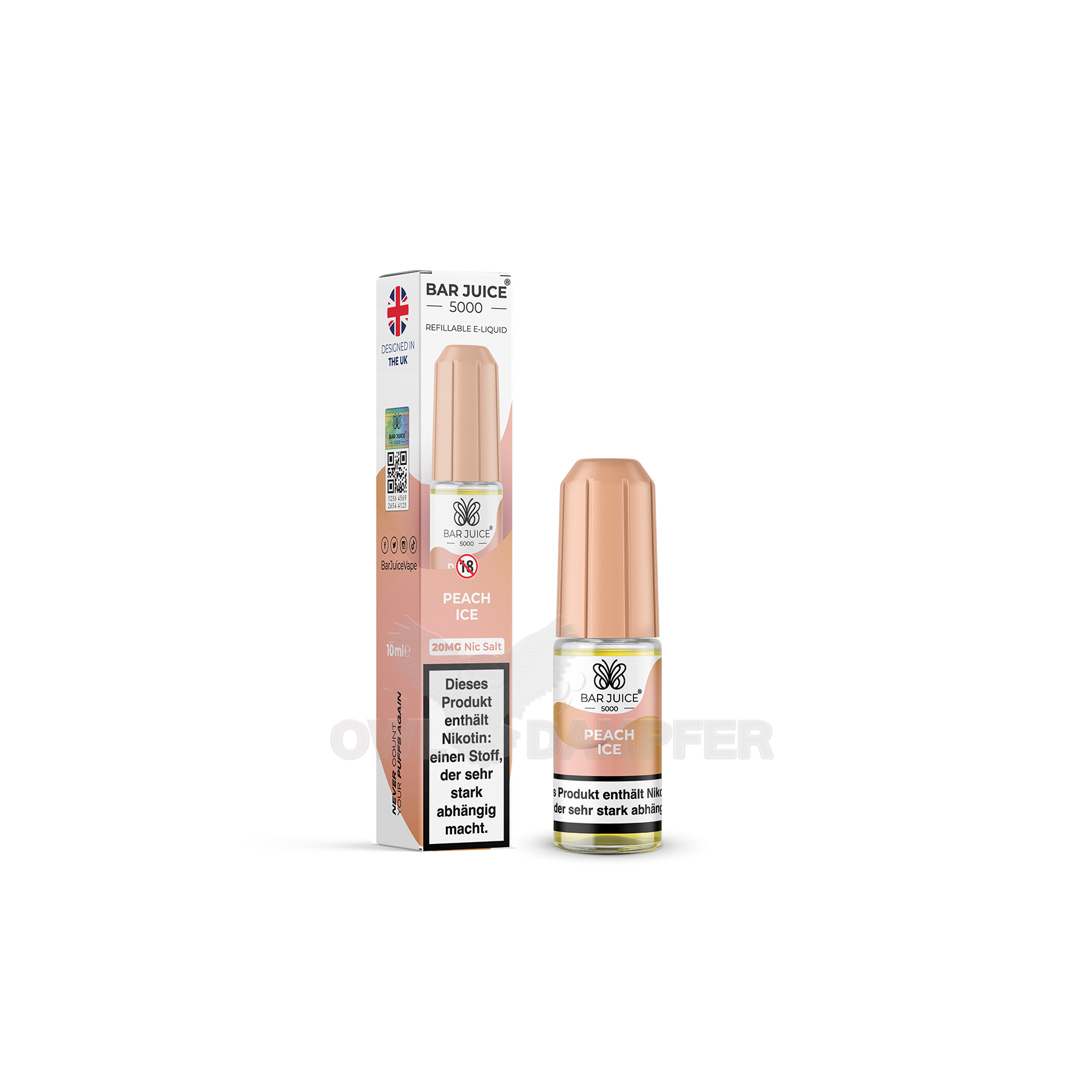 Mit dem Bar Juice 5000 Peach Ice Nic Salt E-Liquid liegst du in einem Moment entspannt auf einer Sommerwiese, nur um im nächsten durch frostige Winterluft zu gleiten. Ein Wechselspiel aus Hitze und Kälte, das überrascht – und begeistert.
