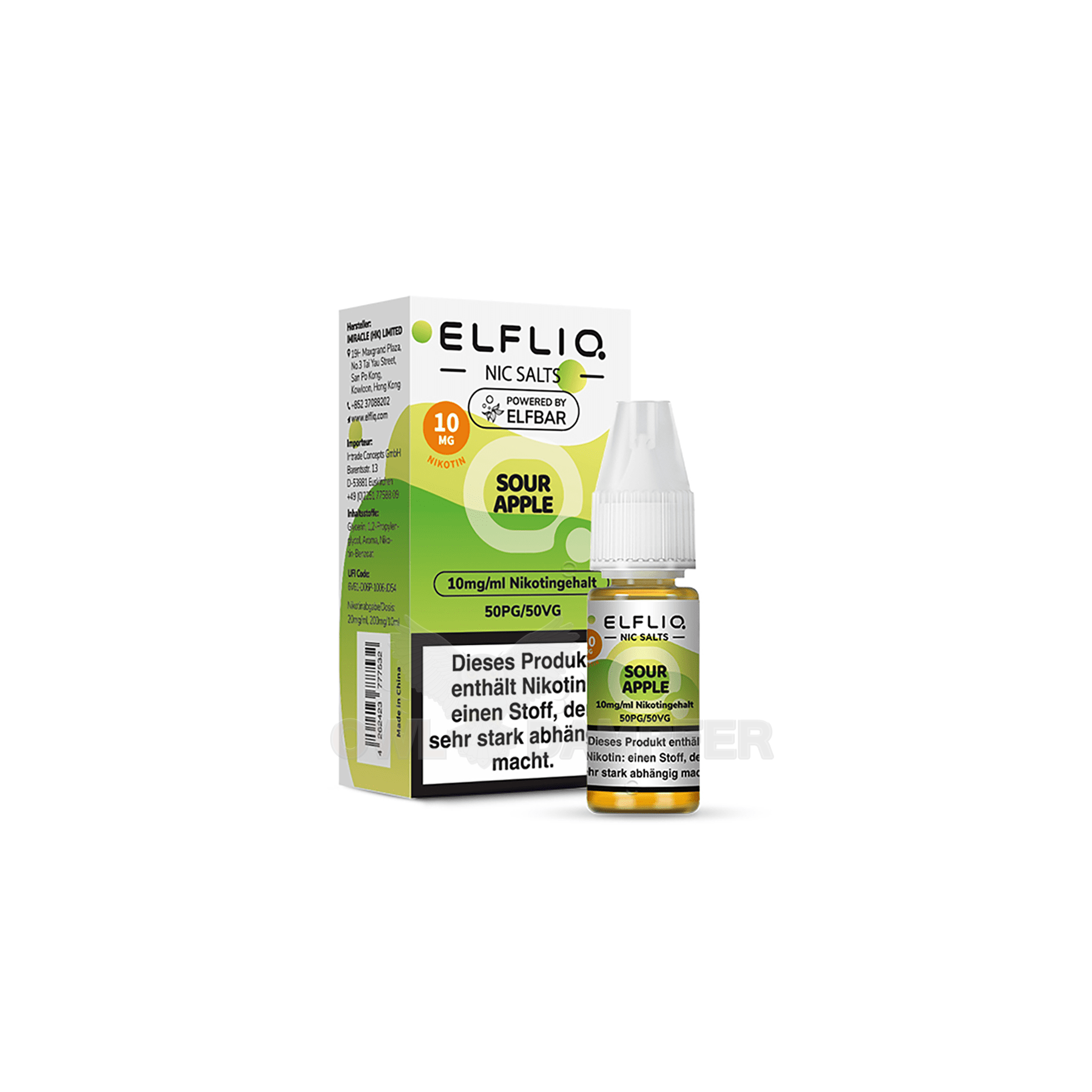 Beim Dampfen des ELFLIQ Nikotinsalz-Liquids Sour Apple entfaltet sich der Geschmack von sauren Äpfeln. Das Nikotinsalz-Liquid ist in den Nikotinstärken 10 mg/ml oder 20 mg/ml erhältlich. Entscheiden Sie sich für dieses Liquid, erhalten Sie 10 ml Nikotinsalz-Liquid in einer 10 ml Flasche.
