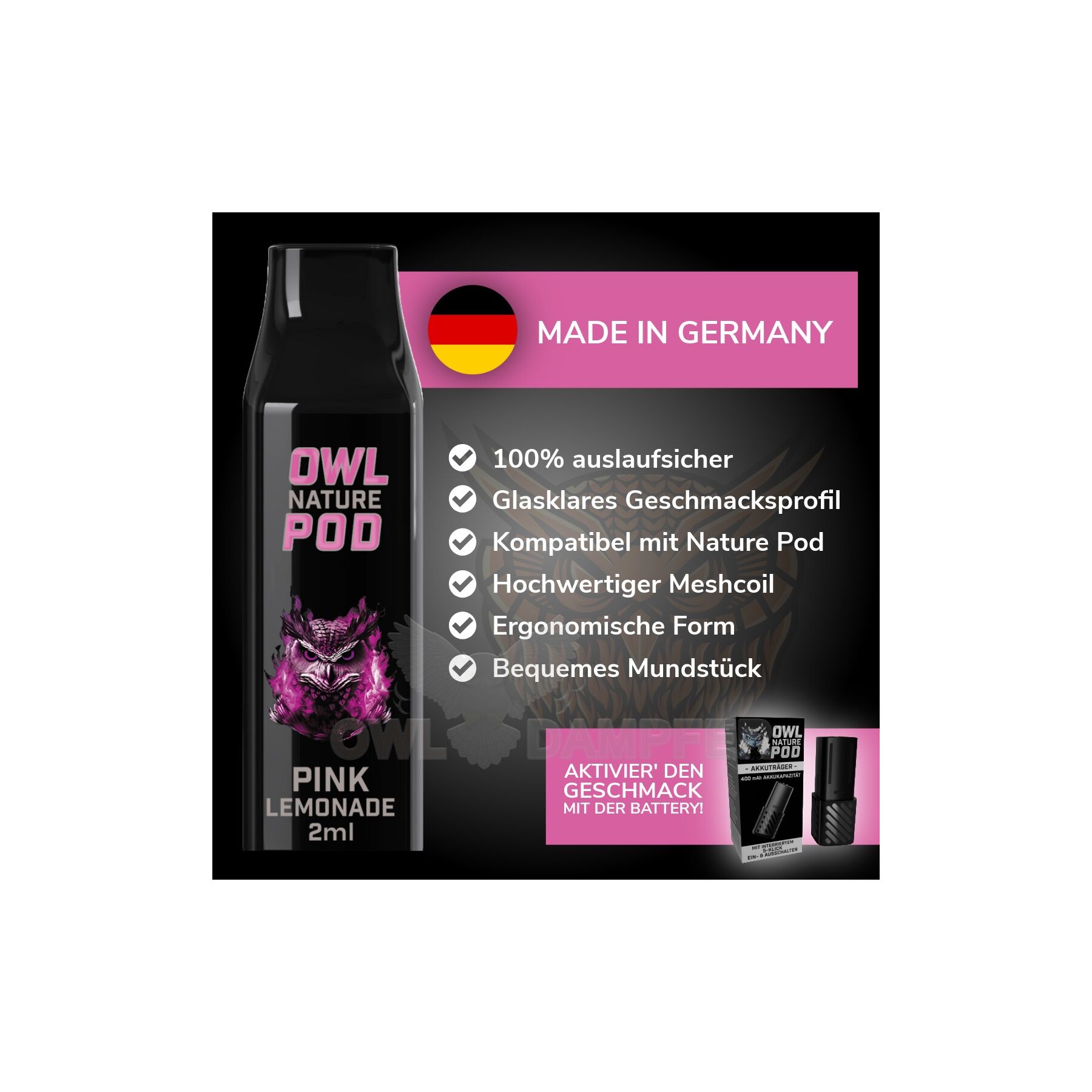 - Vielfältige Geschmackserlebnisse: Genießen Sie ab sofort das neuartige Dampferlebnis mit dem OWL Nature POD in verschiedenen Sorten: Eisbonbon, Kräuterbonbon, Himbeerbonbon, Mango, Kirsche, Minze, Cola, Kiwi Passionfruit Guava, Peach Ice, Erdbeer Vanille Waffel, Orange Zitronenbonbon, Pink Lemonade und Strawberry Kiwi.