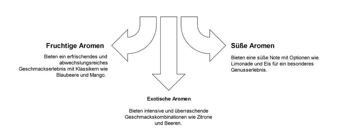 Das Sortiment reicht von fruchtig über süß bis hin zu exotisch – besonders beliebt sind die spritzigen Limonade-Aromen mit ihrem erfrischenden Geschmack. Dank hoher Aromadichte überzeugen alle Sorten mit vollem, authentischem Aroma.